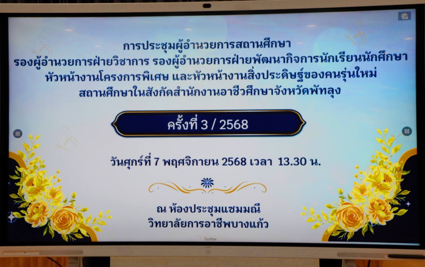 วันศุกร์ ที่ ๗ พฤศจิกายน ๒๕๖๘ เวลา ๑๓.๓๐ น. นายศิริวัฒน์ รักสกุล ผู้อำนวยการวิทยาลัยการอาชีพบางแก้ว ปฏิบัติหน้าที่ผู้อำนวยการสำนักงานอาชีวศึกษาจังหวัดพัทลุง ประชุมผู้อำนวยการสถานศึกษา รองผู้อำนวยการฝ่ายวิชาการ รองผู้อำนวยการฝ่ายพัฒนากิจการนักเรียนนักศึกษา หัวหน้างานโครงการพิเศษ และหัวหน้างานสิ่งประดิษฐ์ของคนรุ่นใหม่ สถานศึกษาในสังกัดอาชีวศึกษาจังหวัดพัทลุง ครั้งที่ ๓/๒๕๖๘ เพื่อกำหนดทิศทาง และนโยบาย ขับเคลื่อนแผนงานโครงการต่างๆ ให้เป็นไปในทิศทางเดียวกัน ณ ห้องประชุมแซมมณี ชั้น ๒ อาคารอำนวยการวิทยาลัยการอาชีพบางแก้ว (ภาพประกอบเพิ่มเติม) |