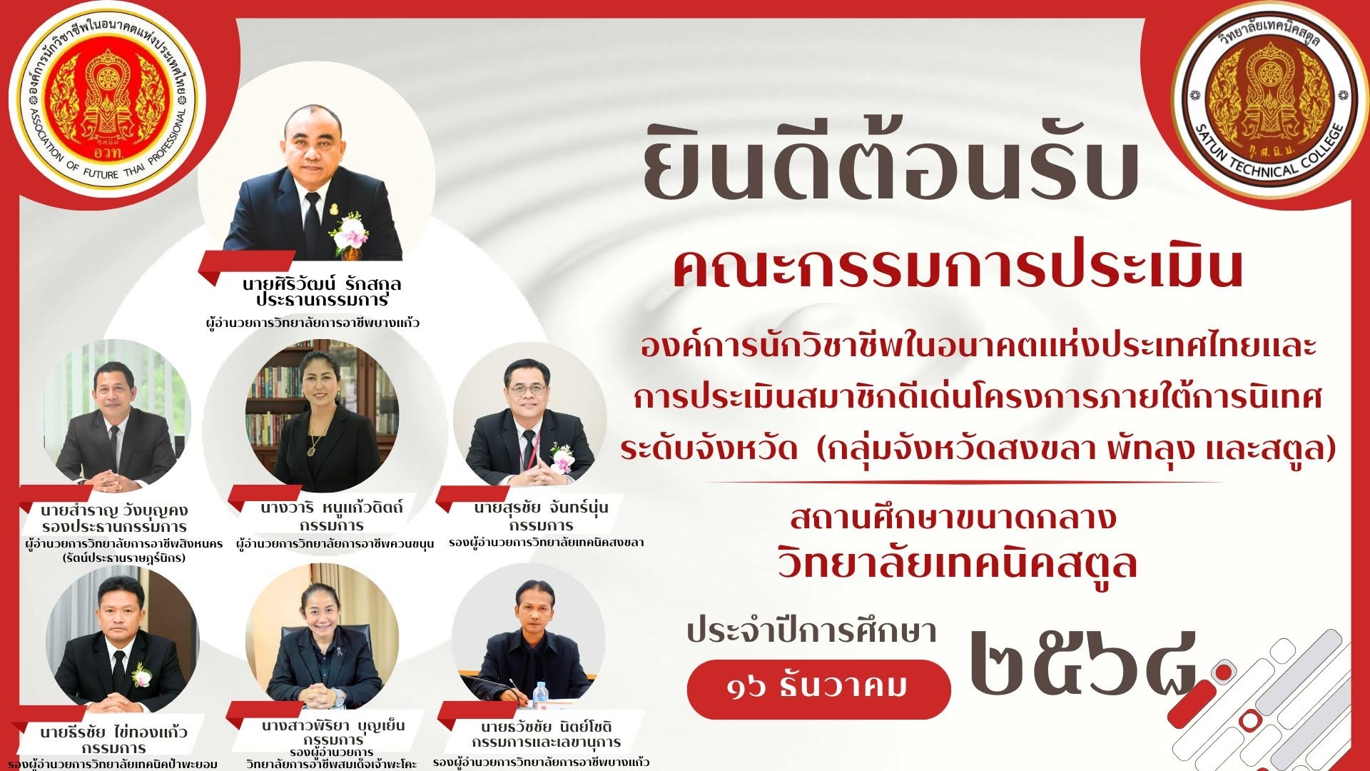การประเมินองค์การมาตรฐานดีเด่น ระดับกลุ่มจังหวัด (สตูล พัทลุง สงขลา) สถานศึกษาขนาดกลาง ประจำปีการศึกษา ๒๕๖๘ วันอังคารที่ ๑๖ ธันวาคม ๒๕๖๘ นายศิริวัฒน์ รักสกุล ผู้อำนวยการวิทยาลัยการอาชีพบางแก้ว ทำหน้าที่ ประธานกรรมการ นายธวัชชัย นิตย์โชติ รองผู้อำนวยการ ทำหน้าที่กรรมการและเลขานุการ พร้อมด้วยคณะกรรมการประเมินองค์การนักวิชาชีพในอนาคตแห่งประเทศไทย ระดับกลุ่มจังหวัด (สงขลา พัทลุง และสตูล) สถานศึกษาขนาดกลาง เข้าตรวจการประเมินสมาชิกดีเด่นโครงการภายใต้การนิเทศองค์การนักวิชาชีพในอนาคตแห่งประเทศไทย ระดับจังหวัด ประจำปีการศึกษา ๒๕๖๘ ณ ห้องประชุมอันดามัน ชั้น ๓ วิทยาลัยเทคนิคสตูล (ภาพประกอบเพิ่มเติม) |