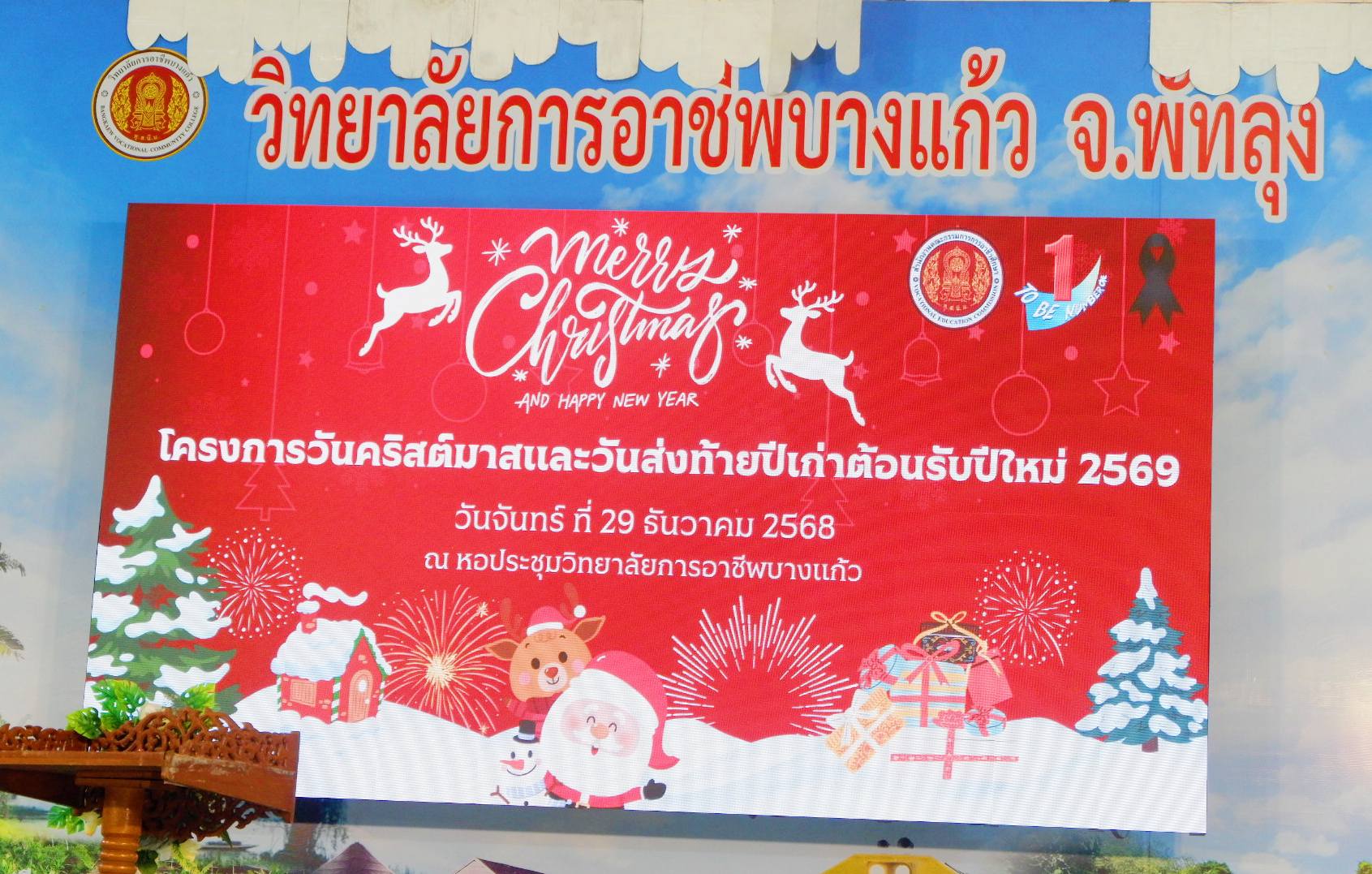 วันจันทร์ที่ ๒๙ ธันวาคม ๒๕๖๘ เวลา ๑๓.๓๐ น. นายศิริวัฒน์ รักสกุล ผู้อำนวยการวิทยาลัยการอาชีพบางแก้ว เป็นประธานในพิธีเปิดโครงการวันคริสต์มาสและวันส่งท้ายปีเก่าต้อนรับปีใหม่ ๒๕๖๙ การจัดกิจกรรมดังกล่าว เป็นการฝึกให้นักเรียนนักศึกษาได้เรียนรู้การทำงานเป็นทีม ได้พัฒนาทักษะชีวิต ได้สร้างความสัมพันธ์ที่ดี และได้เรียนรู้วัฒนธรรมและการอยู่ร่วมกันในสังคม โดยมีคณะครู บุคลากร นักเรียนนักศึกษาเข้าร่วมกิจกรรม ณ หอประชุมวิทยาลัยการอาชีพบางแก้ว (ภาพประกอบเพิ่มเติม) |