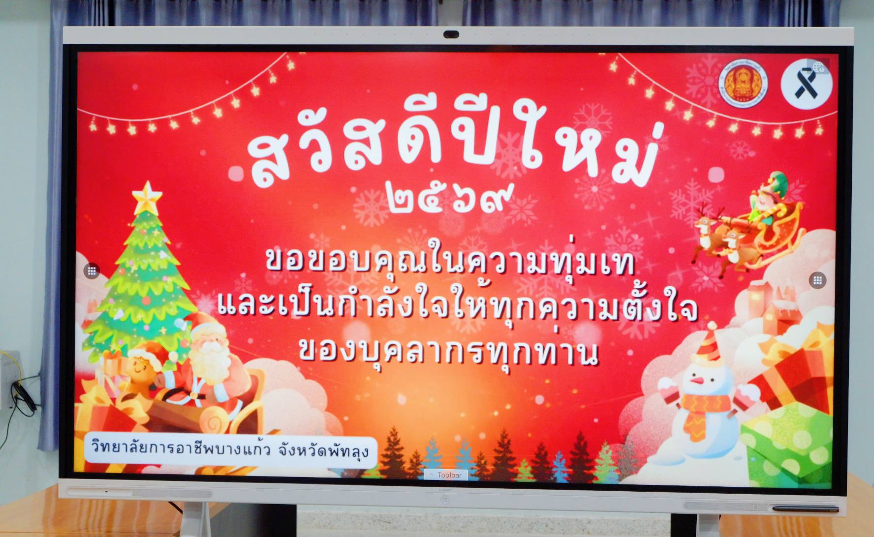 วันจันทร์ที่ ๒๙ ธันวาคม ๒๕๖๘ นายศิริวัฒน์ รักสกุล ผู้อำนวยการวิทยาลัยการอาชีพบางแก้ว กล่าวอวยพรในโอกาสส่งท้ายปีเก่าต้อนรับปีใหม่ ๒๕๖๙ ในนามของคณะผู้บริหาร ขอขอบคุณบุคลากรทุกท่านจากใจจริง ที่ได้ทุ่มเท เสียสละ และร่วมกันทำงานอย่างเต็มที่ความสามารถตลอดปีที่ผ่านมา ขอมอบของขวัญเล็กๆน้อยๆ อาจจะมีมูลค่าไม่มากแต่เต็มไปด้วยความตั้งใจ และคำขอบคุณจากวิทยาลัยฯ เพื่อแทนความห่วงใย กำลังใจ และคำขอบคุณที่มีให้ทุกท่าน ขอให้ทุกท่านและครอบครัวมีสุขภาพแข็งแรง มีความสุข ความเจริญ ก้าวหน้า ประสบความสำเร็จในทุกๆด้าน (ภาพประกอบเพิ่มเติม) |