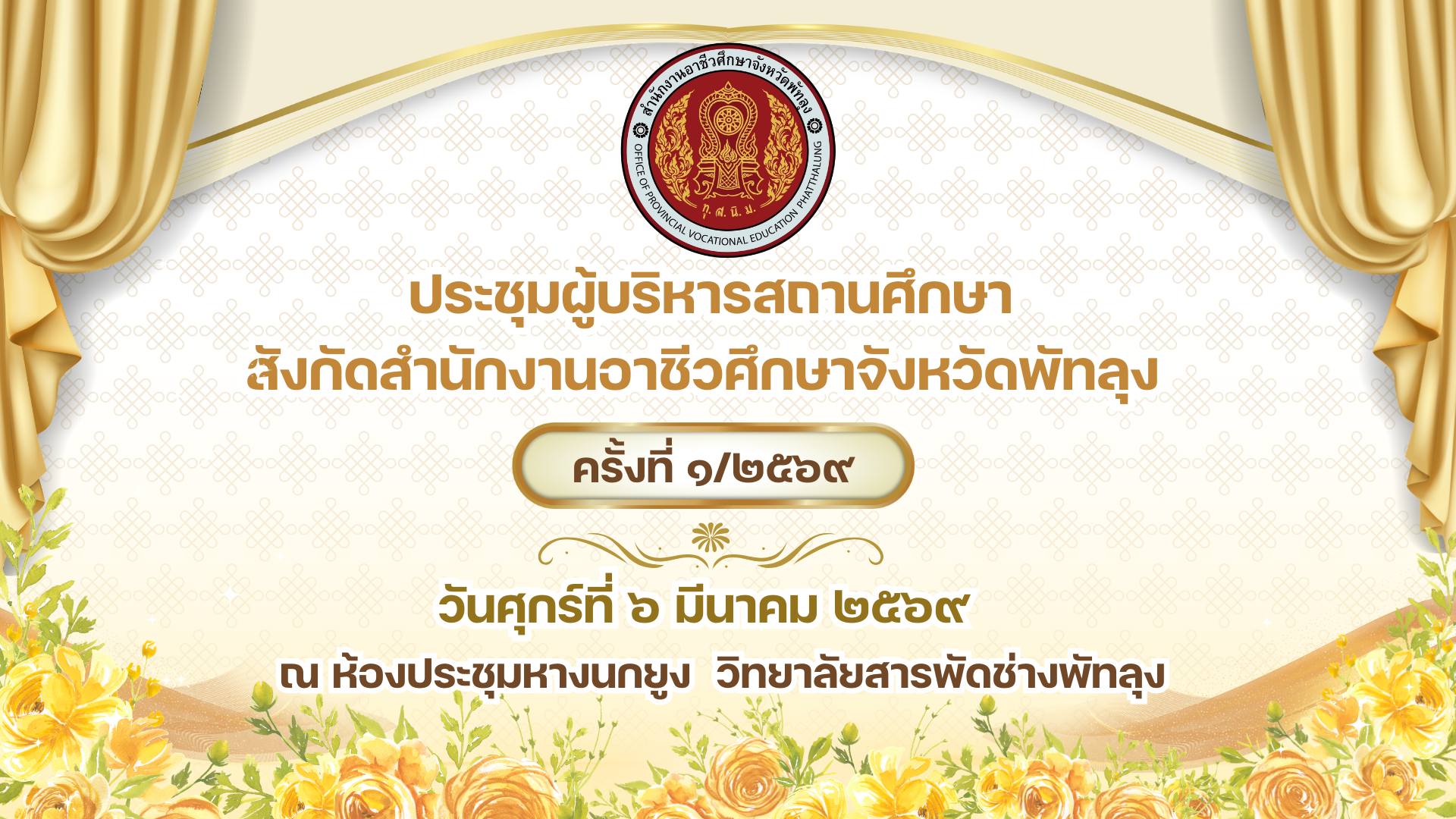 วันศุกร์ที่ ๖ มีนาคม ๒๕๖๙ นายศิริวัฒน์ รักสกุล ผู้อำนวยการวิทยาลัยการอาชีพบางแก้ว ปฏิบัติหน้าที่ผู้อำนวยการสำนักงานอาชีวศึกษาจังหวัดพัทลุง เป็นประธานในการประชุมผู้บริหารสถานศึกษา/รองผู้อำนวยการฝ่ายพัฒนากิจการนักเรียนนักศึกษา เพื่อร่วมกันปรึกษาหารือแนวทางการดำเนินงาน การแข่งขันกีฬาอาชีวะเกมส์ ๒๕๖๙ ระดับภาคใต้และการคัดเลือกตัวแทนนักกีฬา ระดับสำนักงานอาชีวศึกษาจังหวัดพัทลุง ณ ห้องประชุมหางนกยูง วิทยาลัยสารพัดช่างพัทลุง (ภาพประกอบเพิ่มเติม) |