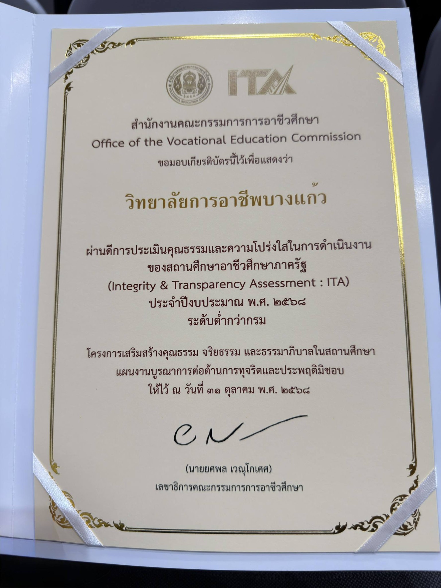 วันพุธที่ ๒๕ มีนาคม ๒๕๖๙ นายศิริวัฒน์ รักสกุล ผู้อำนวยการวิทยาลัยการอาชีพบางแก้ว มอบหมายให้ นายวิทวัส พฤกษวานิช ครูผู้ช่วย เข้ารับเกียรติบัตรยกย่องเชิดชูเกียรติสถานศึกษาอาชีวศึกษา ผ่านเกณฑ์การประเมินคุณธรรมและความโปร่งใสในการดำเนินงาน ประจำปีงบประมาณ พ.ศ. ๒๕๖๘ ซึ่งมอบโดย นายยศพล เวณุโกเศศ เลขาธิการคณะกรรมการการอาชีวศึกษา ณ หอประชุมคุรุสภา กระทรวงศึกษาธิการ Integrity and Transparency Assessment : ITA อยู่ภายใต้โครงการเสริมสร้างคุณธรรม จริยธรรม และธรรมาภิบาลในสถานศึกษา แผนบูรณาการต่อต้านการทุจริตและประพฤติมิชอบ (ภาพประกอบเพิ่มเติม) |