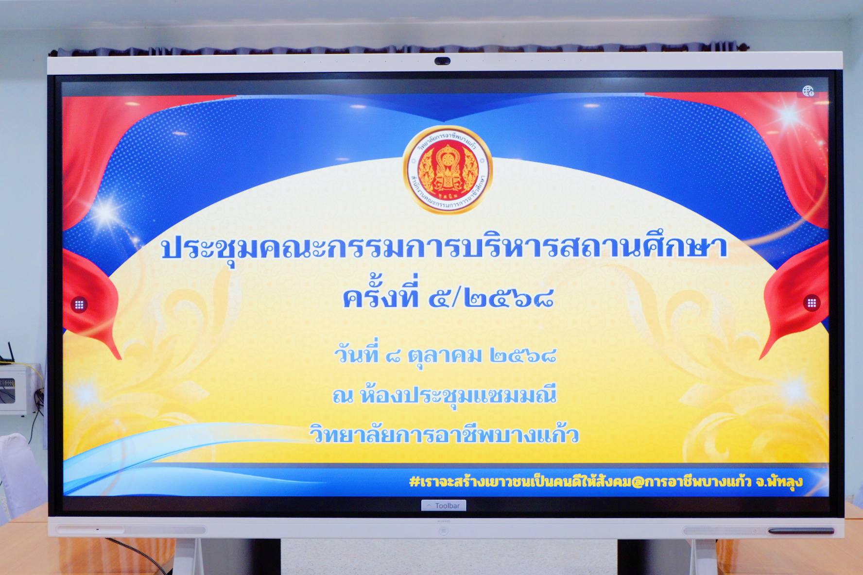 วันพุธที่ ๘ ตุลาคม ๒๕๖๘ เวลา ๐๙.๓๐ น. นายศิริวัฒน์ รักสกุล ผู้อำนวยการวิทยาลัยการอาชีพบางแก้ว เป็นประธานในการประชุมคณะกรรมการบริหารสถานศึกษา ครั้งที่ ๕/๒๕๖๘ เพื่อพิจารณาอนุมัติผลการเรียน/ผลกิจกรรม ภาคเรียนที่ ๑/๒๕๖๘ และมีข้อราชการที่จะปรึกษาหรือณ ห้องประชุมแซมมณี ชั้น ๒ อาคารอำนวยการวิทยาลัยการอาชีพบางแก้ว (ภาพประกอบเพิ่มเติม) |