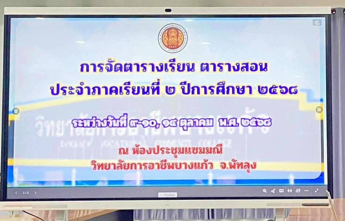 วันพุธที่ ๑๕ ตุลาคม ๒๕๖๘ นายธวัชชัย นิตย์โชติ รองผู้อำนวยการ รักษาราชการแทนผู้อำนวยการวิทยาลัยการอาชีพบางแก้ว พบปะพูดคุยให้แนวทางกับคณะครูในการจัดตารางและการตรวจตารางเรียนประจำภาคเรียนที่ ๒/๒๕๖๘ โดยให้คุณครูทุกคนช่วยกันจัดตารางและตรวจว่าตารางเรียนมีความสมดุลระหว่างรายวิชาหนัก-เบา คุณครูแต่ละท่านมีภาระงานเหมาะสมหรือไม่ ตารางไม่ชนหรือไม่ซ้ำซ้อนกันของรายวิชาและเวลาเรียน (ภาพประกอบเพิ่มเติม) |