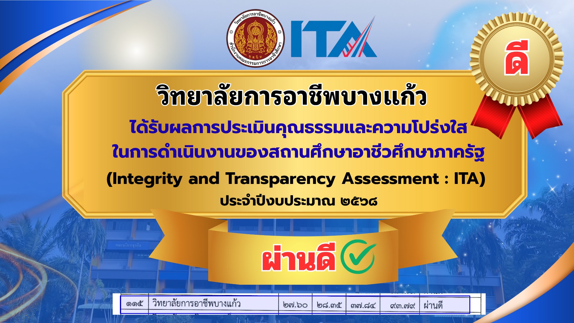 วิทยาลัยการอาชีพบางแก้ว จังหวัดพัทลุง ได้รับผลการประเมินคุณธรรมและความโปร่งใสในการดำเนินงานของสถานศึกษาอาชีวศึกษาภาครัฐ (Integrity and Transparency Assessment:ITA) ประจำปีงบประมาณ ๒๕๖๘ โดยมีสำนักงานคณะกรรมการป้องกันและปราบปรามการทุจริตแห่งชาติ (ป.ป.ช.) เป็นผู้ประเมินหลัก |