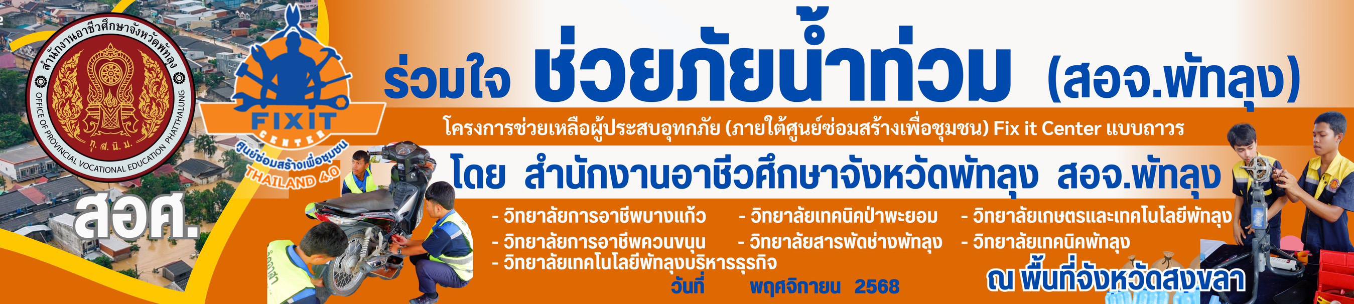 สำนักงานอาชีวศึกษาจังหวัดพัทลุง โดยนายศิริวัฒน์ รักสกุล ผู้อำนวยการวิทยาลัยการอาชีพบางแก้ว นำสถานศึกษาสังกัดอาชีวศึกษาจังหวัดพัทลุง ร่วมด้วยช่วยกัน ช่วยเหลือผู้ประสบภัย(หลังน้ำลด)ในพื้นที่หาดใหญ่ Fix it จิตอาสา ระหว่างวันที่ ๒๙-๓๐ พฤศจิกายน ๒๕๖๘ บริการ อำนวยความสะดวก บรรเทาความเดือดร้อน เบื้องต้น แนะนำ ซ่อม เครื่องใช้ไฟฟ้า จักรยานยนต์ เครื่องมือประกอบอาชีพ "บริเวณเดอะซิกเนเจอร์ โฮเทล แอร์พอร์ต " แถวๆแยกเข้าสนามบิน ในวันเสาร์-อาทิตย์ที่ ๒๙-๓๐ พฤศจิกายน ๒๕๖๘ ร่วมกับทีม วท.หาดใหญ่ และทีมชุมพร (ภาพประกอบเพิ่มเติม) |