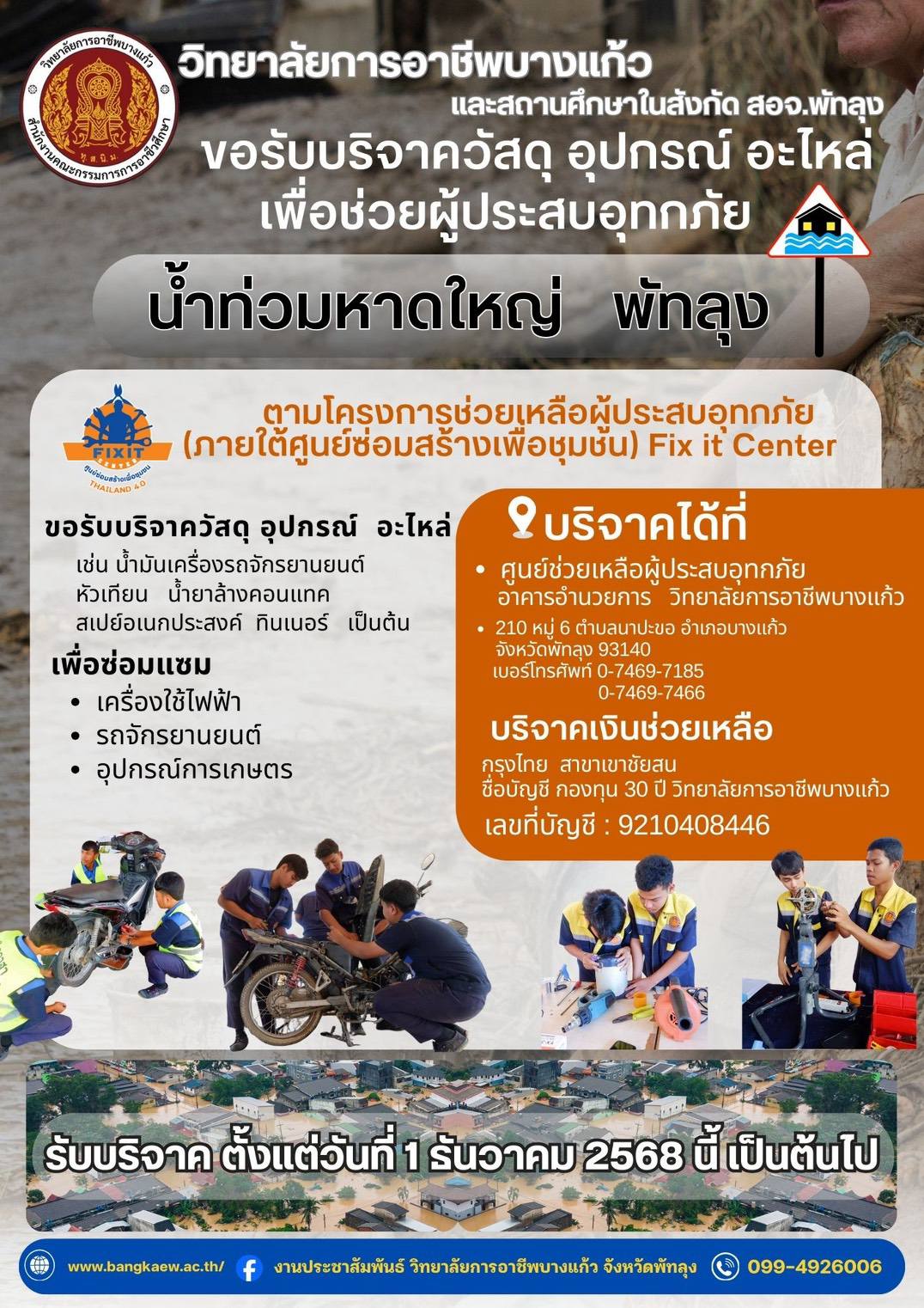 วันอังคารที่ ๒ ธันวาคม ๒๕๖๘ วิทยาลัยการอาชีพบางแก้ว ในนามสำนักงานอาชีวศึกษาจังหวัดพัทลุง ต้องขอขอบคุณ คุณวัลภา สถิรชวาล ประธาน อ.กรอ.อศ. กลุ่มอาชีพโลจิสติกส์ และประธานสมาพันธ์โลจิสติกส์ไทย รวมถึงผู้บริหารทุกท่าน ร่วมสมทบทุนและให้การสนับสนุนในการช่วยเหลือผู้ประสบภัยในพื้นที่หาดใหญ่ผ่านสำนักงานอาชีวศึกษาจังหวัดพัทลุง จำนวน 6,666.- บาท (ภาพประกอบเพิ่มเติม) |