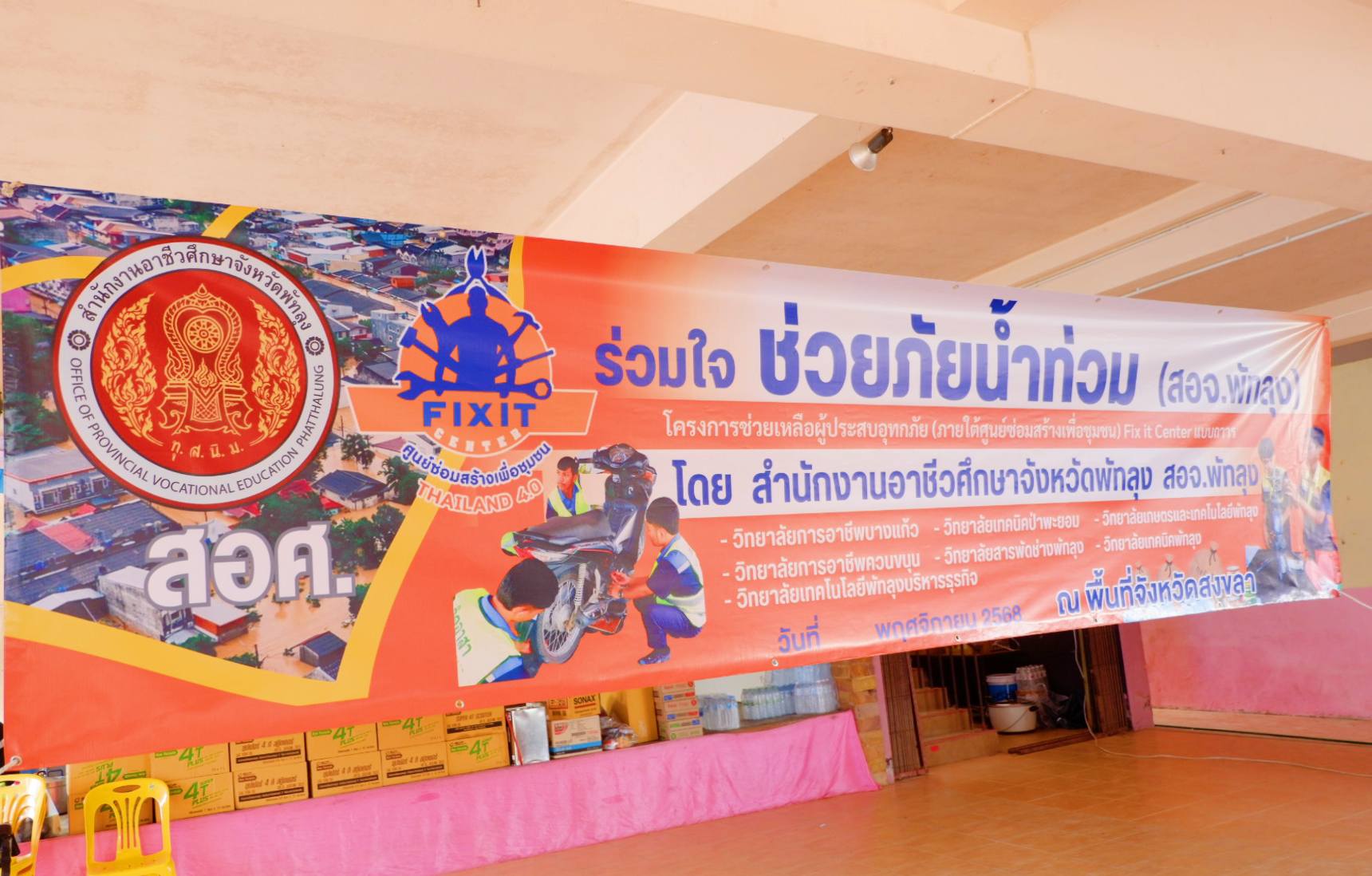 Fix it จิตอาสา(วันที่ ๗ ของการลงพืันที่) บรรยากาศศูนย์ Fix it จิตอาสา วันศุกร์ ที่ ๕ ธันวาคม ๒๕๖๘ นายศิริวัฒน์ รักสกุล ผู้อำนวยการวิทยาลัยการอาชีพบางแก้ว ปฏิบัติหน้าที่ผู้อำนวยการสำนักงานอาชีวศึกษาจังหวัดพัทลุง นำสถานศึกษาสังกัดอาชีวศึกษาจังหวัดพัทลุง ประกอบด้วย วิทยาลัยเทคนิคป่าพะยอม วิทยาลัยการอาชีพควนขนุน วิทยาลัยสารพัดช่างพัทลุง วิทยาลัยการอาชีพบางแก้ว ลงพื้นที่ช่วยเหลือผู้ประสบภัยอุทกภัย จังหวัดสงขลา บริการฟรี!! บริการซ่อมเครื่องใช้ไฟฟ้า ซ่อมรถจักรยานยนต์ เครื่องยนต์และอุปกรณ์ทางการเกษตร |