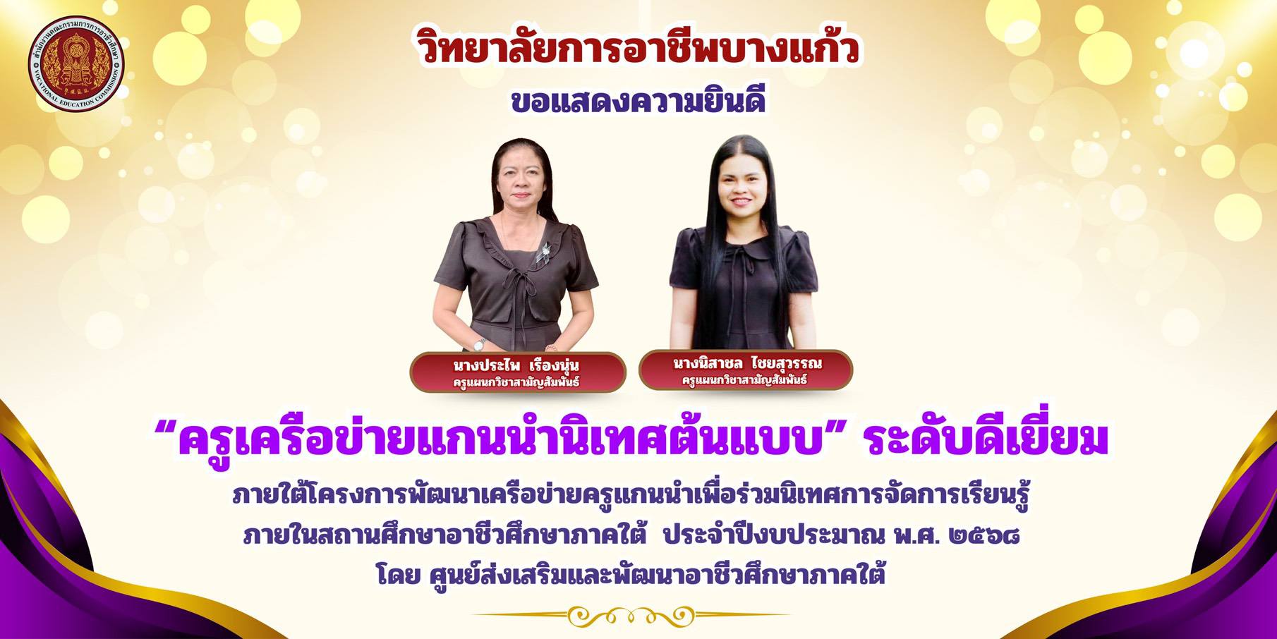 วันพฤหัสบดีที่ ๑๑ ธันวาคม ๒๕๖๘ วิทยาลัยการอาชีพบางแก้ว ขอแสดงความยินดี “ครูเครือข่ายแกนนำนิเทศต้นแบบ” ระดับ ดีเยี่ยม จำนวน ๒ ท่าน ได้แก่ นางประไพ เรืองนุ่น ครูแผนกวิชาสามัญสัมพันธ์ นางนิสาชล ไชยสุวรรณ ครูแผนกวิชาสามัญสัมพันธ์ ภายใต้โครงการการพัฒนาเครือข่ายครูแกนนำเพื่อร่วมนิเทศการจัดการเรียนรู้ ภายในสถานศึกษาอาชีวศึกษาภาคใต้ ประจำปีงบประมาณ พ.ศ.๒๕๖๘ โดย ศูนย์ส่งเสริมและพัฒนาอาชีวศึกษาภาคใต้ (ภาพประกอบเพิ่มเติม) |