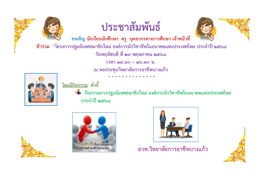 เชิญชวนคณะผู้บริหาร ครู บุคลากรทางการศึกษา นักเรียนนักศึกษา เข้าร่วมโครงการปฐมนิเทศสมาชิกใหม่ องค์การนักวิชาชีพในอนาคตแห่งประเทศไทย ประจำปี 2568 ณ หอประชุมวิทยาลัยการอาชีพบางแก้ว |