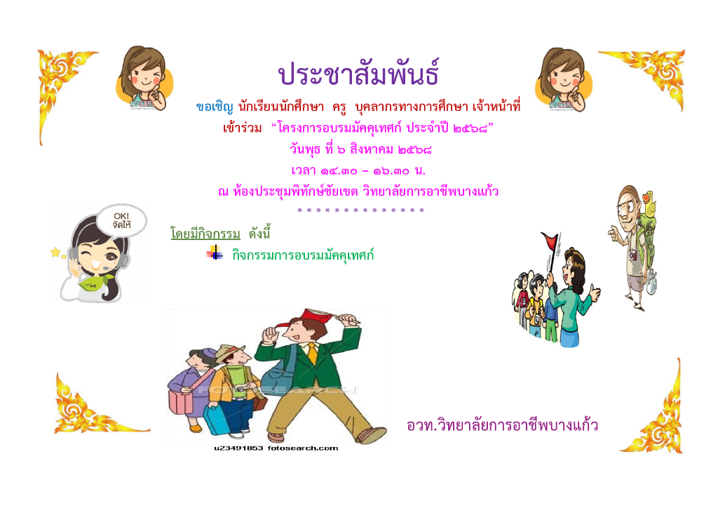 เชิญชวนคณะผู้บริหาร ครู บุคลากรทางการศึกษา นักเรียนนักศึกษา เข้าร่วมโครงการอบรมมัคคุเทศก์ ประจำปี 2568 ณ ห้องประชุมพิทักษ์ชัยเขต วิทยาลัยการอาชีพบางแก้ว