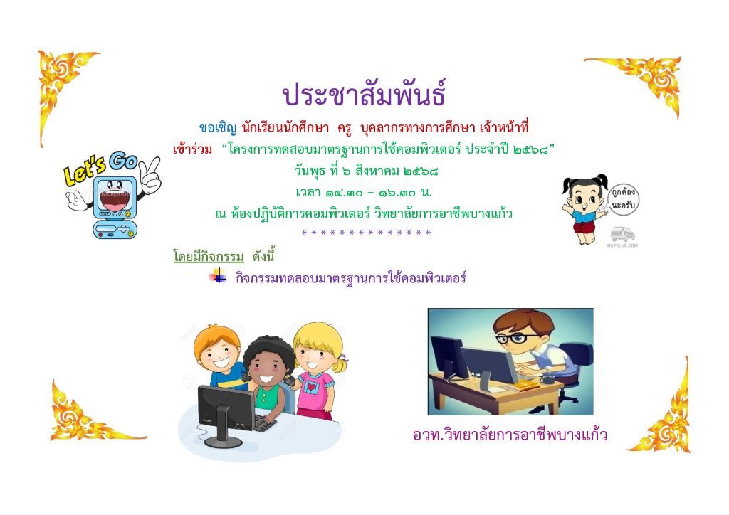 เชิญชวนคณะผู้บริหาร ครู บุคลากรทางการศึกษา นักเรียนนักศึกษา เข้าร่วมโครงการทดสอบมาตรฐานการใช้คอมพิวเตอร์ ประจำปี 2568 ณ ห้องปฏิบัติการคอมพิวเตอร์ วิทยาลัยการอาชีพบางแก้ว |