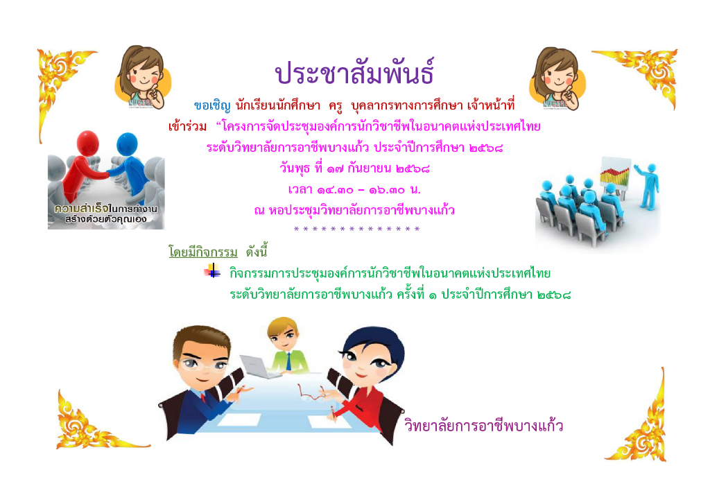 เชิญชวนคณะผู้บริหาร ครู บุคลากรทางการศึกษา นักเรียนนักศึกษา เข้าร่วมโครงการจัดประชุมองค์การนักวิชาชีพในอนาคตแห่งประเทศไทย ระดับวิทยาลัยการอาชีพบางแก้ว ประจำปีการศึกษา 2568 ณ หอประชุมวิทยาลัยการอาชีพบางแก้ว