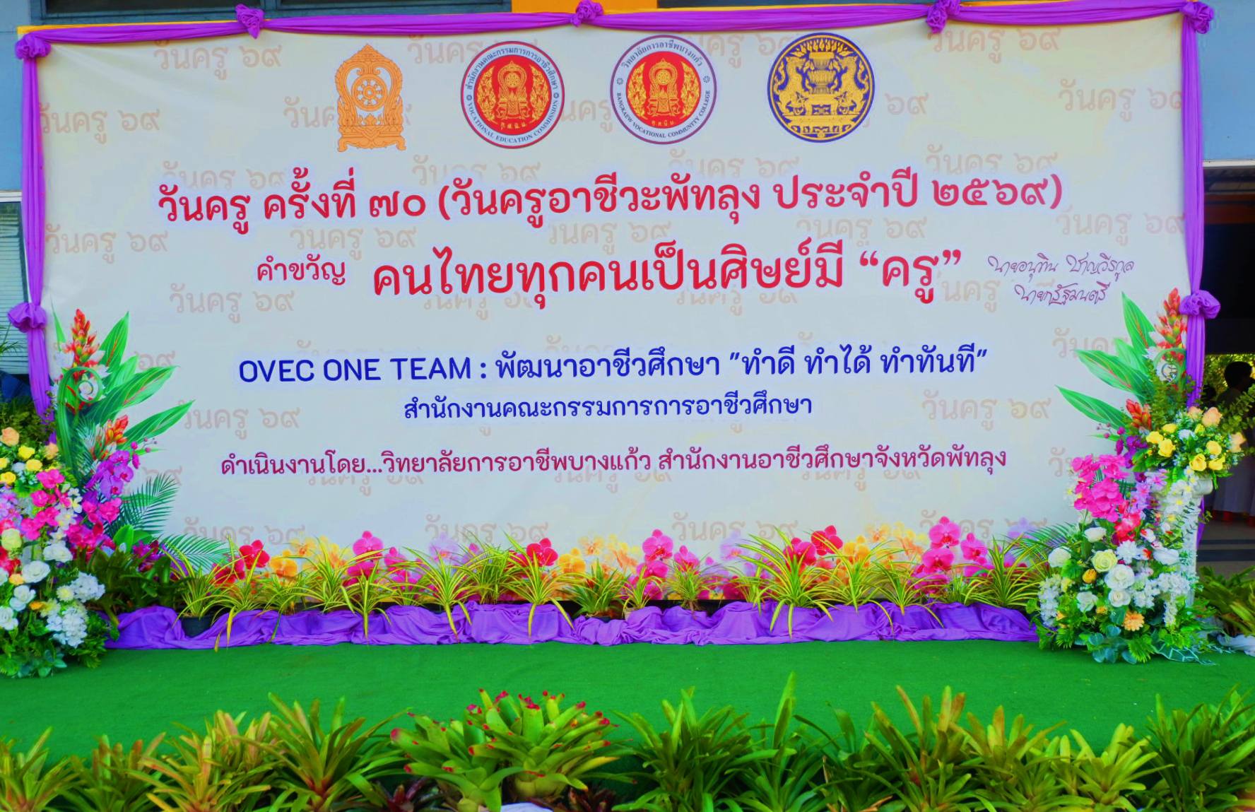 วิทยาลัยการอาชีพบางแก้ว สำนักงานอาชีวศึกษาจังหวัดพัทลุง โดยนายศิริวัฒน์ รักสกุล ผู้อำนวยการ จัดงานวันครูอาชีวะพัทลุง ๖๙ โดยจัดกิจกรรมทำบุญตักบาตร และพิธีรำลึกคุณครูบาอาจารย์ และมอบเกียรติบัตรเชิดชูเกียรติ รางวัลผู้บริหารดี ศรีอาชีวะพัทลุง รางวัลครูดี ศรีอาชีวะพัทลุง และรางวัลบุคลากรสนับสนุนการศึกษาดี โดยมีคณะผู้บริหาร ครู บุคลากรทางการศึกษาจากสถานศึกษาจำนวน ๗ สถานศึกษาเข้าร่วม ทั้งนี้ได้รับเกียรติจากครูอาวุโส และแขกผู้มีเกียรติ เข้าร่วมกิจกรรมดังกล่าว ณ บริเวณหอประชุมวิทยาลัยการอาชีพบางแก้ว |