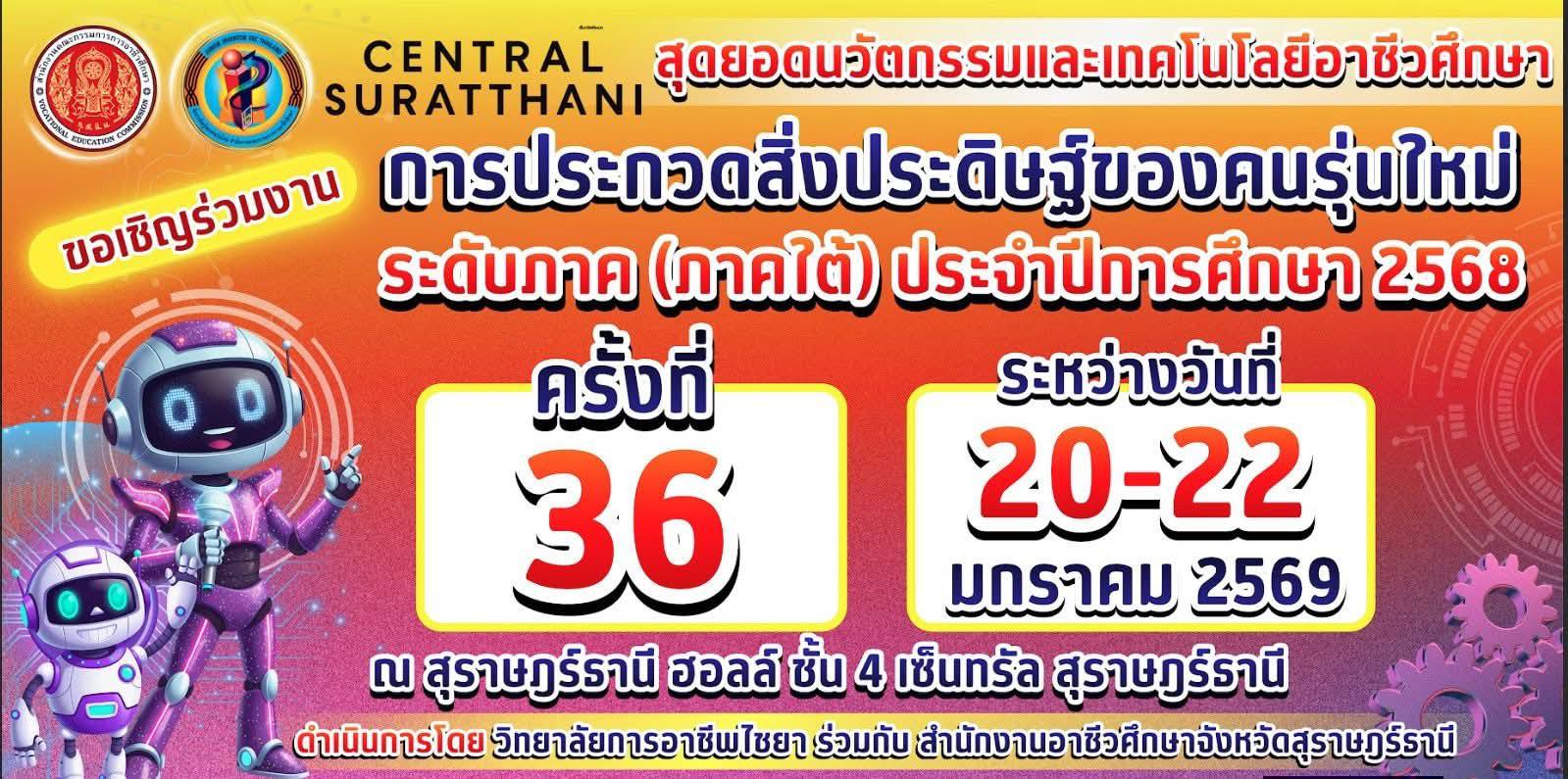วันอังคารที่ ๒๐ มกราคม ๒๕๖๙ นายศิริวัฒน์ รักสกุล ผู้อำนวยการวิทยาลัยการอาชีพบางแก้ว พร้อมด้วยคณะครู และนักเรียน นักศึกษา เข้าร่วมการแข่งขัน สุดยอดนวัตกรรมและเทคโนโลยีอาชีวศึกษา การประกวดสิ่งประดิษฐ์ของคนรุ่นใหม่ ระดับภาค (ภาคใต้) ครั้งที่ ๓ ประจำปีการศึกษา ๒๕๖๘ ระหว่างวันที่ ๒๐-๒๒ มกราคม ๖๙โดยมีสิ่งประดิษฐ์เข้าร่วมการแข่งขัน และร่วมเป็นคณะกรรมการตัดสินผลงาน ดังนี้ สิ่งประดิษฐ์ประเภทที่ ๓ ด้านนวัตกรรมและเทคโนโลยีพลังงานสิ่งแวดล้อม (ทุ่นปั๊มน้ำอัตโนมัติด้วยระบบ IOT Automatic water pump buoy using an IOT system) สิ่งประดิษฐ์ ประเภทที่ ๕ ด้านนวัตกรรมและเทคโนโลยีเพื่อสุขภาพ (HEALTH CARE) เตียงออกกำลังกายส่วนขาเพื่อสุขภาพ V.๒ เป็นประธานกรรมการตัดสินประเภทที่ ๖ ร่วมเป็นกรรมการตัดสินประเภทที่ ๓ ณ HALL ชั้น ๔ ศูนย์การค้าเซ็นทรัลพลาซา จังหวัดสุราษฎร์ธานี |